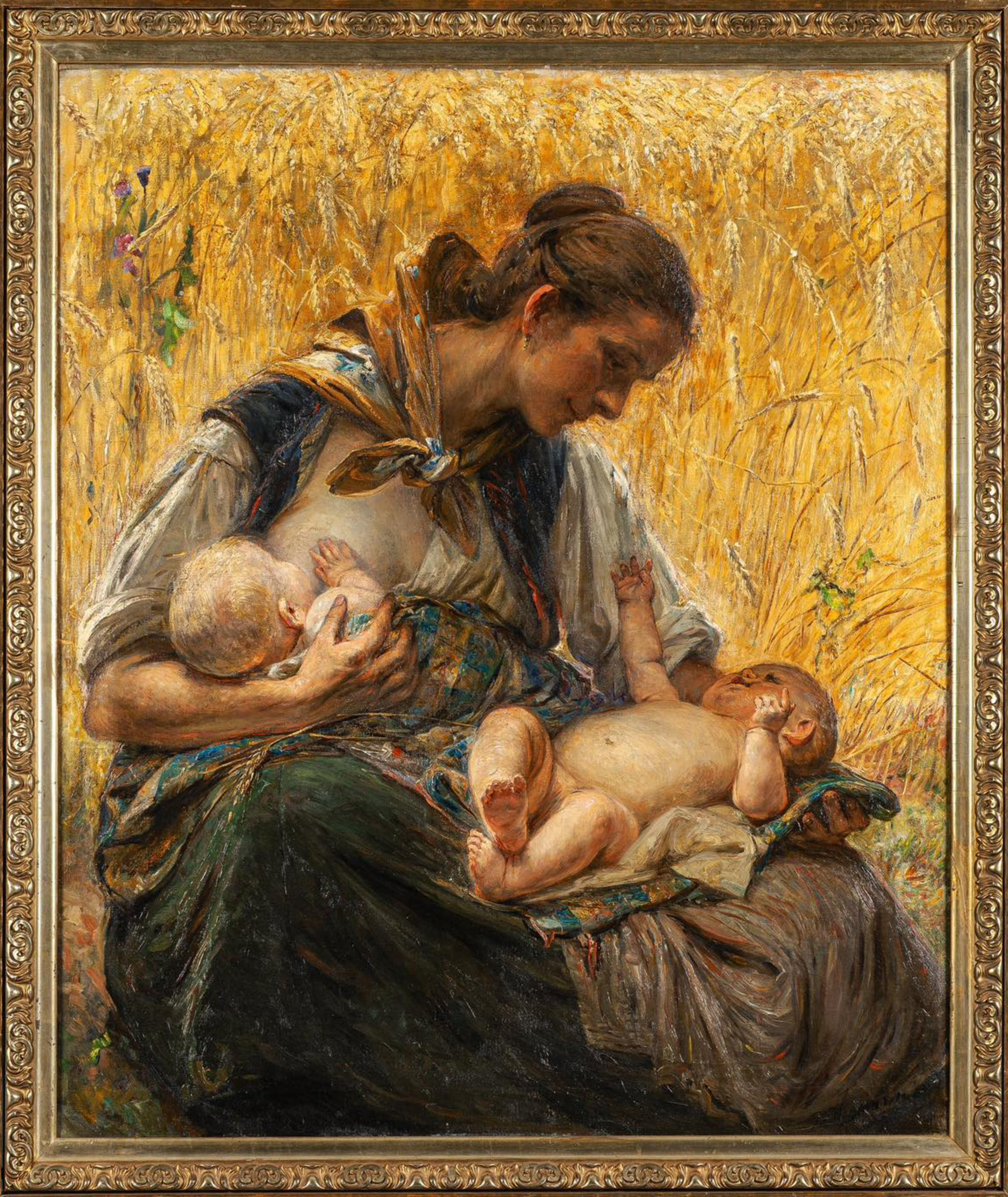 Z jednej strony pokazanie afirmacji życia, a z drugiej strony cielesności, która nie ma nic wspólnego z erotyzmem, ale właśnie z podkreśleniem siły. I ten witalizm najczęściej w przypadku przynajmniej skandynawskich artystów, on najczęściej przekładał się na przedstawienia męskich ciał, ale ta matka w tym „Lecie” jest taka właśnie silna, chroni swoje dziecko. Dodatkowo te kłosy w tle też przekładają się na metaforę życia, jakiejś takiej…